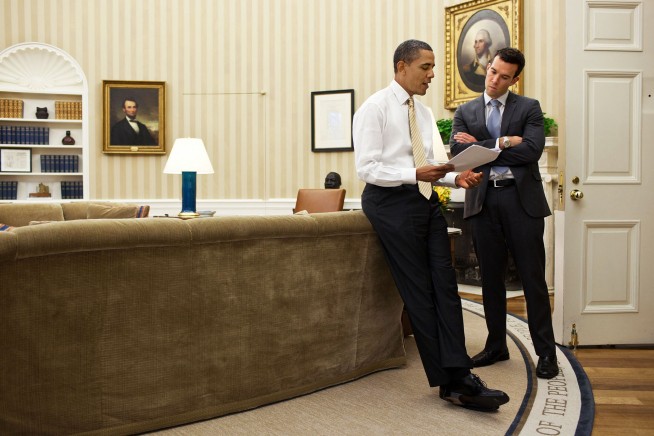 Favreau: There are many different ways to communicate with the President. Since he works so late at night, he’ll have to call me, so I’ll have to be aware that if my phone rings and it’s a blocked or private number, then it’s probably the White House operator telling me that the President is on the phone. Or we’ll email back and forth about a speech when he has some edits, or when he just needs to see me up in the residence or in the Oval, when there’s time for edits. During the day it’s much easier; he’ll just call me at my desk and I’ll run upstairs, and we’ll talk that way.